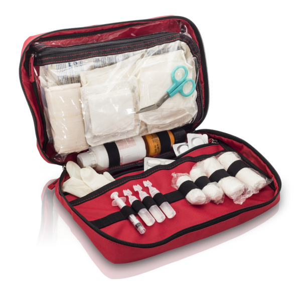 – Deux poches (une d’elles avec fermeture éclair) pour gants, gazes et autres pansements